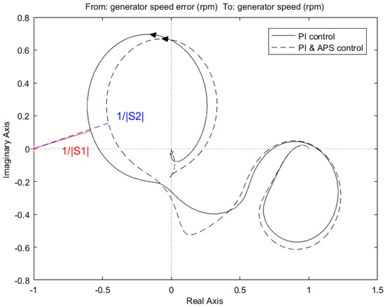 The sensitivity peak analysis of the FOWT control system with and without APS control loop is shown in Figure 6. For that, a unity negative closed-loop feedback of the conventional PI and the linearised plant is used. This robustness analysis is important to check the influence of the implemented APS control loop in the control system sensitivity. Thus, the inverse of the sensitivity peak is the minimum distance between Nyquist curve and critical point −1 + 0j. As shown in Figure 6, the Nyquist curve of the transfer function including the APS control loop shows a larger minimum distance (1/|S2|) to the critical point than that presented by the conventional PI control loop (1/|S1|), meaning the implementation of the APS control loop increases the robustness of the control system.