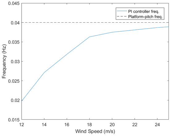 As mentioned previously, over the above rated wind speed region the controller natural frequency must not exceed the platform-pitch natural frequency. Figure 8 shows the platform-pitch natural and controller bandwidth frequencies in above rated wind speeds. This was checked by analysing the crossover frequency of the open-loop bode diagram including the PI controller and the FOWT linear plant model at each wind speed over the above rated wind speeds until the cut-out wind speed. At low wind speeds, near to the rated generator speed, the PI controller present lower bandwidth frequency than at high wind speeds. This increase goes according to the aerodynamic rotor sensitivity between power and thrust coefficients, ensuring lower controller frequency than the platform-pitch natural frequency in all wind speeds.