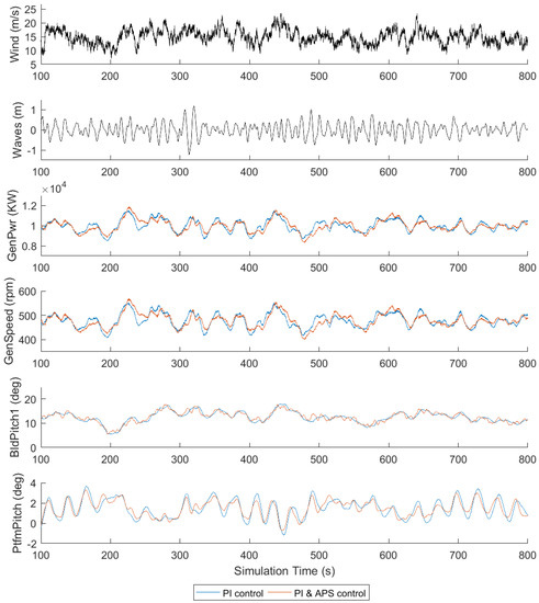 The maximum, minimum, mean () and standard deviation () of the time-domain simulation results are summarised in Table 1. Small differences are shown between PI and APS control statistic results in the generator power and generator speed, meaning that the APS control loop does not perturb the normal performance of those variables. However, the platform pitch results shows more conservative maximum and minimum values, whereas standard deviation with the implementation of the APS control, meaning that effectively the APS control loop reduces de platform-pitch oscillations.