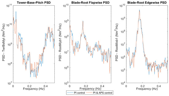 The Power Spectral Density (PSD) of a time series provides the information about the energy concentration in the frequency-domain regions. This analysis helps identifying which frequencies collect more activity of the measured signal. In this case, the critical FOWT tower-base-pitch, blade-root flapwise and edgewise bending moments are analysed as shown in Figure 10. The same time interval as that considered for the time-domain simulation is used for the PSD analysis, not taking into account the first 100 s to avoid transients of the start-up. Appreciable improvements are achieved at low frequencies where the APS control technique has the highest influence. The blade-root flapwise bending moment result is smaller at this frequency range due to the reduction in the rotor thrust thanks to the vigorous blade-pitch reaction, whereas the tower-base pitch bending moment is smaller due to the reduction of the platform-pitch oscillations. The blade-root edgewise bending moment presents very similar results for both control strategies, meaning that the implementation of the APS control loop does not negatively affect to the blade-root edgewise. There is no negative impact on the rotor speed frequency (1P = 0.16 Hz) as well as on the blade passing frequency (3P), as it can be seen in the plot.