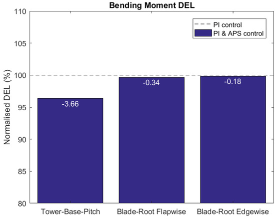 The Damage Equivalent Load (DEL) is a typical approach for assessing the overall fatigue loading damage impact of a given time-history load signal. In this case, the DELs have been calculated with the rain-flow counting method for a life time extrapolation of 20 years. The APS control loop results are compared to the conventional PI detuned results, and given in percentages. The tower-base-pitch, blade-root flapwise and edgewise bending moments DELs are shown in Figure 11. Substantial improvement of 3.66% in the tower-base-pitch bending moment is shown with the implementation of the APS control loop. No remarkable improvement is shown in the blade-root flapwise and edgewise bending moments; however, these results confirm that the APS control loop has no a negative effect on the blade-root loads.