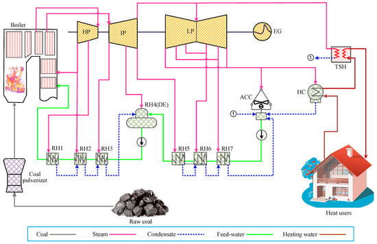 A representative 300 MW subcritical HBP-CHP unit in Northeast China was deemed as a basic case for comparative investigation, which could be improved by the proposed concept. As depicted in Figure 1, the reference unit includes a pulverized coal-fired boiler and a single-reheating steam turbine. The coal burned by the boiler is lignite with a high concentration of moisture, as given in Table 1. There are three high-pressure regenerative heaters (RH), one deaerator (DE), and three low-pressure RHs in the heat regenerative system, associated with a direct air-cooling condenser (ACC). The HBP heating design has been exploited in this CHP unit. A part of the exhaust steam is used to heat the supply-water of the primary heating network in the heating condenser (HC). As the back-pressure of the steam turbine remains at 34 kPa, the supply-water can be heated up to 70°C (the saturation temperature in the HC is about 72 °C and the terminal temperature difference is kept above 2 °C for its high-efficiency operation). Afterward, the warmed supply-water will further obtain energy from the extraction steam in the thermal-system heater (TSH) and be heated up to 80–100 °C. The TSH may not be activated on condition that the supply-water of 70 °C can meet the heating requirement of the heat users when the weather is not very cold.