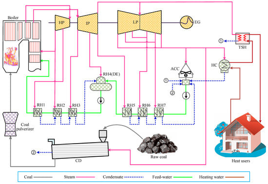 Diagram of the modified HBP heating system integrated with raw coal pre-drying (based on the reference HBP-CHP unit).