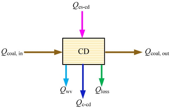 The energy balance of the coal pre-drying process is illustrated in Figure 3. The global heat exchange of the CD can be described as follows.