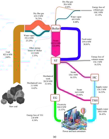 To explore the root cause of the energy-saving due to the proposed concept and to discover the details of the energy migration caused by the raw coal pre-drying, the primary energy flows that took place in the original HBP-CHP unit and modified one were outlined, as depicted in Figure 4. The energy contained in the coal was calculated based on its higher heating value (HHV), and the theoretical energy flows of the dry flue gas and the water vapor were considered separately for detecting the energy variation of the coal due to its dehydration. In the optimized unit, while a portion of the exhaust steam is used for dewatering the raw coal, the energy of 22.0 MW is transferred from the exhaust steam to the raw coal in the steam-rotary CD, and some water vapor is separated and discharged. As a consequence, the energy loss of the exhaust steam drops by 22.0 MW (2.74%) and the exhaust steam recovery efficiency increases by 7.9% (absolute value), as compared to the conventional design. In theory, the energy of the raw coal (823.6 MW, 100%) can convert into the energy of the dry flue gas (632.2 MW, 76.75%) and the energy of the water vapor (191.4 MW, 23.25%) during the combustion in the boiler of the original unit, resulting in a large energy waste of the exhaust flue gas (108.3 MW, 13.15%), including 69.9 MW (8.48%) energy carried by the water vapor. However, the moisture content of the raw coal is significantly reduced by pre-drying in the new cogeneration system, hence less energy is taken along with the water vapor after the coal burning. In the modified unit, the energy of the dried coal (800.2 MW, 100%) turns into the energy of the dry flue gas (661.7 MW, 82.69%) and the energy of the water vapor (138.5 MW, 17.31%) after combustion, and the energy share of the water vapor diminishes from 23.25% to 17.31%. Furthermore, the energy loss of the exhausted water vapor falls by 2.46% (absolute value) and the total energy loss of the exhaust flue gas declines by 2.51% (absolute value). As the energy loss of the exhaust flue gas is reduced significantly, the boiler efficiency (based on the raw coal) is enhanced and less raw coal is needed to produce the same live steam and reheated steam in the proposed HBP-CHP unit.