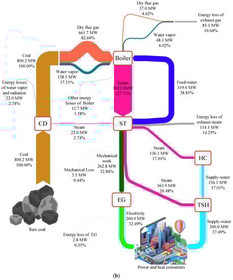 Diagram of the primary energy flows in the original HBP-CHP unit and proposed HBP-CHP unit: (a) Original unit; and (b) Proposed unit.