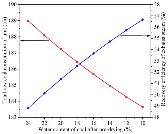 During the pre-drying of the raw coal, a part of the moisture contained in the raw coal is expelled in the form of vapor and the water vapor is discharged out of the CD. The relationship between the water content of the dried coal and the energy-saving benefit of the proposed design was investigated based on the raw coal prior to dewatering, as illustrated in Figure 5. As more water is evicted from the raw coal, more energy needs to be provided by the exhaust steam, and the recovery efficiency of the exhaust steam rises. Besides, the energy taken along with the water vapor after the coal combustion in the boiler furnace will fall with the decrease of the water content in the dried coal, conducive to lessening the energy loss of the flue gas drained from the boiler, which enhances the boiler performance and cuts down the total raw coal consumption of the cogeneration unit. When the moisture content of the coal drops from 24% to 10% due to the pre-drying, the total raw coal consumption of the unit is reduced by 5.4 t/h (2.86%).