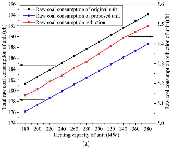 Figure 6 shows the effect of the unit heating capacity on the performance of the modified configuration. When the unit heating capacity gets larger, the total raw coal consumptions of the original HBP-CHP unit and proposed one are raised and the coal consumption reduction caused by the new concept also becomes a little bigger, but the variation is not distinct. As the unit heating capacity ranges from 180 MW to 380 MW, the coal consumption reduction only rises from 5.14 g/kWh to 5.49 g/kWh, though the recovery efficiency promotion owing to the optimized design increases from 6.65% to 8.87% (absolute value). It is evident that the energy-saving effect of the modified HBP heating system is relatively constant while the unit heating capacity changes, which implies that steady economic returns can be brought through the proposed retrofitting during the heating season.