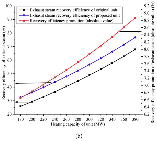 Impact of the unit heating capacity on the performance of the proposed design: (a) Total raw coal consumption of unit; and (b) recovery efficiency of the exhaust steam.