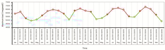 Electricity demand in Libya has risen dramatically in the past fifteen years due to a population growth of about 1 million. Libya is one of the largest countries in North Africa relative electricity consumption. Peak demand was more than 7000 MW over the past four years. The national electricity grid consists of a high-, medium-, and low-voltage network of about 31,500 km [20]. The distribution of citizens in small widely distributed villages makes the connection of these areas an impractical solution. These areas rely on off-grid diesel generators to fulfill their power needs. In general, there are 200 scattered nearby villages with populations ranging between 25 and 500 inhabitancies, and far from the grid by no less than 25 km. That makes electricity-network distribution relatively expensive [21]. According to statistics of the General Electricity Company of Libya (GECOL), energy demand had significant growth between 2003 and 2012 recorded [22], and that increase in energy demand in the household sector in Libya stresses decision makers to have a clear strategy to reduce carbon emissions and energy use by improving occupants’ behavior as well as utilizing other sustainable measures [23]. As shown in Figure 1, the actual demand between January 2014 and April 2016 varied and reached up to 7000 MW. The 2011 civil war led to the destruction of some transmission lines and substations. This led to a decrease in power stations’ generation ability to 5050 MW, which caused a gap of more than 1950 MW between supply and demand, resulting in many blackouts during 2015, 2016, and 2017. For instance, the western region was plunged into a total blackout in June 2017 for many days. A blackout also hit western and southern Libya in January 2017.