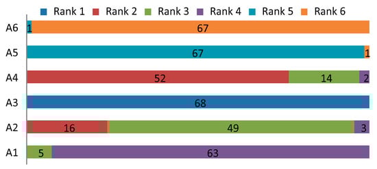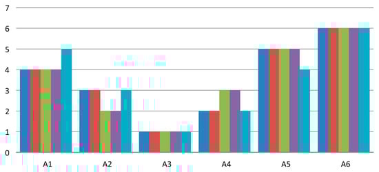 The research involved four experts () with weight coefficients , , and . It should be noted that, in developing countries, some technologies are more appropriate than others. In this research, the following PGTs were considered: Gas-fired-power generation (A1), Geothermal-power generation (A2), Solar-photovoltaic-power generation (A3), Solar-thermal-power generation (A4), Wind-power generation (A5), and oil-fired power generation (A6). The evaluation of the alternatives by criteria was carried out using a set of linguistic variables , where s = {s0—exceedingly low, s1—pretty low, s2—low, s3—slightly low, s4—medium, s5—slightly high, s6—high, s7—pretty high, s8—exceedingly high}.