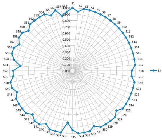Values of SK correlation of ranges through scenarios were obtained by comparing the initial rank of the LNN PW-CODAS model (Table 9) with ranks obtained through the scenarios. From Figure 4, we can see that there are no significant deviations in ranking through the 68 scenarios. In all scenarios, the values of SK did not fall below 0.829. The average SK value for all scenarios was 0.980, which shows that rank correlation was very high through the scenarios. Since all SK values were significantly higher than 0.8, we can conclude that there was very high correlation (closeness) of rankings, and that the proposed rank is confirmed and credible [77].