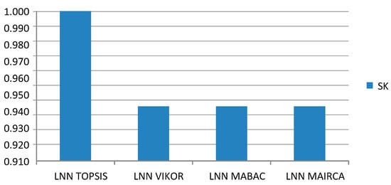 Spearman’s coefficient of rank correlation was used to determine the relation between results obtained by different approaches. The results of the ranking comparison show extremely high correlation between the applied models. Correlation between the LNN PW-CODAS and LNN TOPSIS model is 1.00, while the correlation between LNN PW-CODAS and the remaining models is 0.943 (Figure 6).