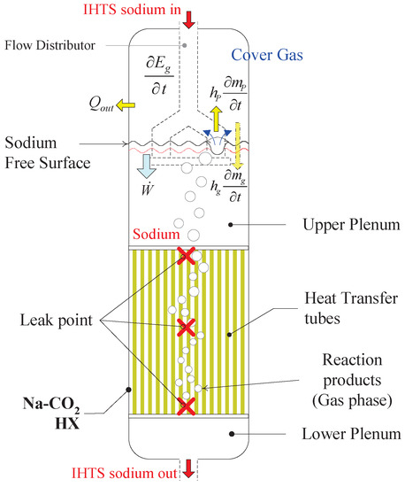 Employing supercritical CO (S-CO) gas as an alternative matter replacing steam/water in an SG, the sodium-CO heat exchangers as a Sodium-to-Gas Heat Exchanger (SGHX) are used instead of steam generators in the S-CO Brayton cycle to generate electric power. The SGHX with the S-CO Brayton cycle shown in Figure 1 is advantageous in a couple of ways compared with the conventional Rankine cycle SG [9]. In addition to its high thermal efficiency and its potential compactness of the heat-exchanger system with the S-CO Brayton cycle [9,10], it can be a safer system than conventional SFR SGs. A sodium-CO reaction is claimed to be milder than an SWR [10,11,12]. Referring to [13], the liquid sodium and CO gas is categorized as a rate-controlled process, because its reaction rate strongly depends on the reaction condition, and the chemical reaction speed between sodium and CO gas is consequently much slower than that of an SWR.