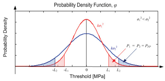 When there is no damage in a system , the residual r for monitoring is centered around its average 0 as a bell-curve shape shown in Figure 3. The figure shows two curves with small and large variances . The probability of false alarming is the integral of the probability density curve in the outside of the threshold level . L is solved for by having an allowable false alarm rate, which should be very small. For the same false alarm rate, the threshold range for greater variance should be wider as in the figure .