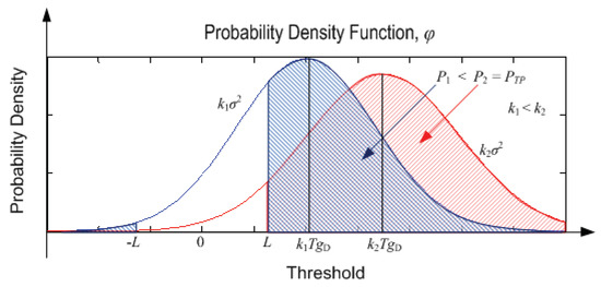 To design the monitoring system (mainly for the threshold level L and detection time ), parameters of the statistics information of sensors and target damage size should be determined with probability inputs and (maximum allowed false alarm and least required true detection probabilities). The least L and soonest are calculated based on the probability model in Equation (11) and descriptions given earlier as follows in Equations (12) and (13).