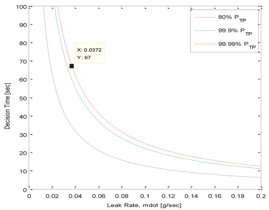 A range of various leak rates including the air mass flow value in Equation (36) is simulated from the relation in Equation (38). The plot in Figure 6 gives the results of the decision time for the leak-rate range. As expected, a longer detection time is required for a small leak rate (damage) than a large one. In other words, for a large damage, the detection time required is very short. Furthermore, for a comparison, the figure contains three cases of : 80%, 99.9%, and 99.99%. For the same amount of damage, a longer detection is required for a higher probability as depicted in the figure. A sample value, for example, of a leak rate of 0.0372 g/s is marked, having a 67 s detection time in the figure.