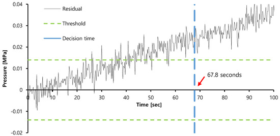 A sample case study of air-injection tests performed in [31] was considered. The residual by pressure measurement data as a black curve of Figure 7 was compared with the calculated L (green dashed line) at (blue dashed line) time. The mean MPa was subtracted from the pressure to yield a residual as in Equation (30). As shown in Figure 7, at the calculated of 67.8 s, 30 cc/s of air injection into the water mock-up test facility was able to be detected with a 99.99% detection probability. The measured pressure is 0.1249 MPa at 67.8 s, and the residual ( MPa) is greater than the upper threshold L of 0.014 MPa.