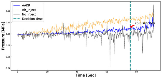 A case study for the pressure monitoring algorithm verification from experimental data [12]: The air injection was detected at the detection time of 67.8 s.