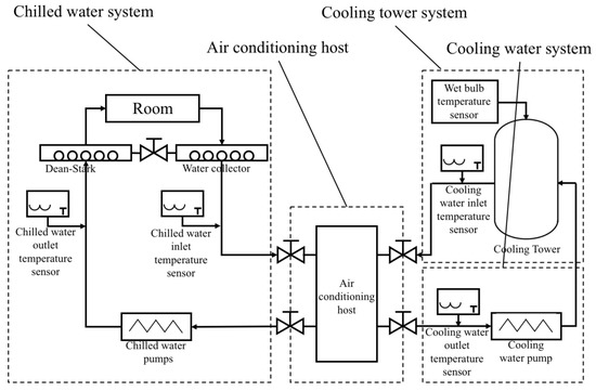 The data are collected from the CACS. Figure 1 shows the structure of the CACS, which consists of four parts: air-conditioning host module, chilled water module, cooling water module, and cooling tower module. The chiller unit uses the PLC to collect signals, control the chilling operation and monitor the chilling operation. Industrial computer is used as the core processor of the entire acquisition control system and touch screen is used as the control devices for terminal parameter acquisition. RS485 converters and Ethernet protocols are used for data transmission. Various types of sensors are used to measure the operating parameters of the chiller in the system, which including chiller current, electric power, electricity consumption, chilled water supply and return water temperature, cooling inlet and outlet water temperature, operating frequency, and wet bulb temperature transmitter.