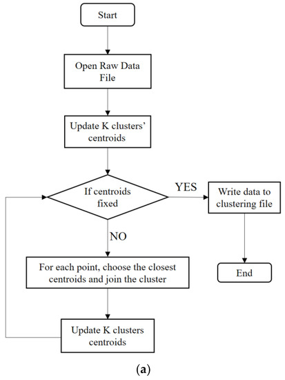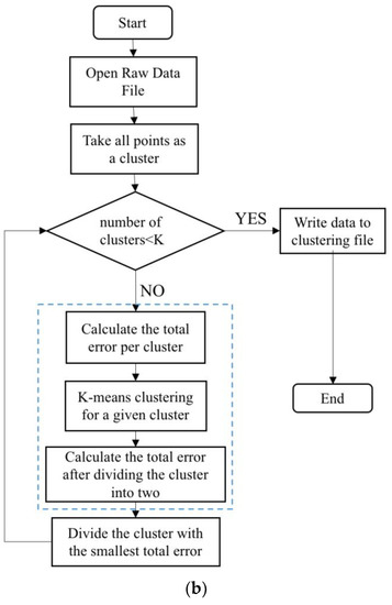 The choice of the initial cluster center has a great impact on the clustering results in k-means clustering. Effective clustering results may be difficult to obtain if the initial value selection is unreasonable. Thus, in order to avoid the algorithm falling into a local optimum during the analysis of the case, this paper uses an improved algorithm called binary k-means clustering. In the binary k-means clustering, the SSE value is judged first, and then the samples are clustered until the k clusters are achieved. Figure 4a,b illustrates the algorithm flow diagrams of the k-means and the binary k-means clustering algorithm. The binary k-means algorithm takes all points as one cluster first, then divides this cluster into two and selects one of the clusters to continue the division process. The cluster that would be selected depends on whether the partitioning of this cluster can minimize the value of the SSE. The whole process is repeated till the number of clusters specified by the user is obtained.