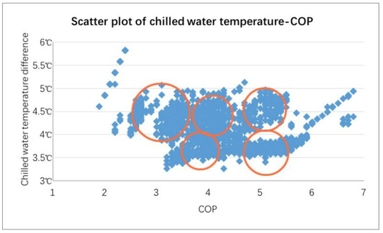 The temperature difference (TD) of the chilled water and the TD of the cooling water were the control parameter that needed to be obtained through cluster analysis, thus they were considered as target indicators and illustrated in Figure 6 and Figure 7. From the scatter plot of the CWTD and COP, the value of k was determined to be around 5. From the scatter plot of the COWTD and COP, the value of k can be determined in the vicinity of 4–5. Thus, it was reasonable to take 5 as the initial value of the k for verification. The error sum of each data and centroid were calculated after each clustering as a standard for verification. The smaller the error, the smaller the error between centroid point and the point in the cluster and the more reasonable the initial value of K. As shown in Figure 8, the change rate of SSE reduced significantly when k is in the range of 5–7 in the process. Therefore, it was reasonable to set the initial k as 6.