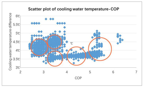 Scatter plots of CWTDs and COPs, scatter plots of COWTDs and COPs were performed. Analysis of experimental data and results are shown in Figure 6 and Figure 7. Data are clustered according to the red circle.
