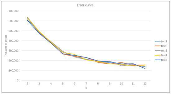 Binary k-means clustering was performed on preprocessed and format-converted data. As shown in Figure 8, SSE with k near 5 is calculated and the result was analyzed. Change rate of SSE became stable after k = 6.
