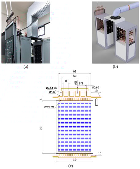 Datacenter racks’ configuration: (a) A general view of datacenter racks arrangement with duct system; (b) 3D-modeling of the datacenter rack, it shows the position of heaters that simulate network servers; (c) Dimensions of the thermosiphon in cm.