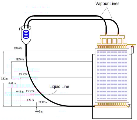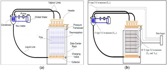 A fin-and-tube thermosiphon heat exchanger made of copper pipes and aluminum fins was attached on the back of one of the racks. The surface area of the thermosiphon is 1.11 × 0.69 m² including collector and header, and it consists of 48 vertical copper tubes with 9.52 mm nominal diameter (10.3 mm collar diameter after expansion). The header of the thermosiphon consists of five copper pipes (1-inch diameter each) which are connected to another 2 inches diameter extended header as shown in Figure 2a to allow better vapor distribution and easier transmission to the condenser. The thermosiphon represents the evaporator of the STPTL, which was connected with the condenser by an adiabatic fluorothermo-plastic material pipes (PFA). The PFA serves as vapor line and liquid line. Two vapor lines of 2 inches diameter and about 2.2 m length were used for lowering transmission impedance to the condenser, whereas one liquid line of 2 inches diameter, 1.65 m length was installed, which is large enough for the condensed liquid to flow back via gravity to the evaporator. The condenser was placed at the highest point close to the ceiling, it should be higher than the thermosiphon to provide enough space for the condensed liquid to accumulate in the liquid line, this is quite essential especially at high filling ratios (e.g., 70% and 90%) because the level of liquid is comparatively high (close to the condenser’s outlet). The condenser is a simple water-cooled shell and coil heat exchanger, and it was designed to reject heating load up to 6 kW. It consists of a 0.75-inch diameter, 3.5 m length coiled copper pipe as shown schematically in Figure 2a. Chilled water is circulated in the coiled pipe, while the R-134a vapor is circulated in the annulus around the tube.