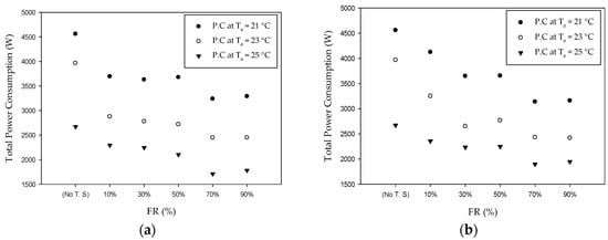 The experiment was conducted subject to three ambient temperatures (21 °C, 23 °C, and 25 °C, respectively) in association with filling ratio ranging from 10~90%. The power consumptions for Pac, Pf, Pch, and Pp, are tabulated in Table 4 and Table 5 for Tc,i = 15 °C and 20 °C, respectively. Figure 3a,b show the measured power consumption at steady state as a function of filling ratios. Yet the typical outlet temperature of the data rack is schematically shown in Figure 4.