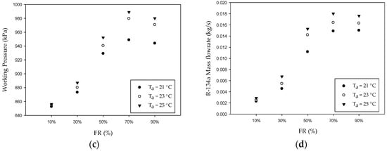 Total power consumed by the cooling system and the corresponding working pressure and mass flow rate of working fluid at different filling ratios: (a) Case (1), total power consumption when Tc,i = 15 °C; (b) Case (2), total power consumption when Tc,i = 20 °C; (c) Working pressure at different filling ratios when Tc,i = 15 °C; (d) Mass flowrate of R-134a at different filling ratios when Tc,i = 15 °C.