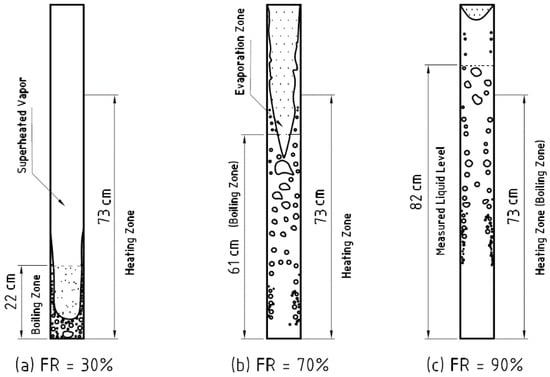 As shown in Table 4 and Table 5, the best power consumption was obtained at filling ratio of 70% where the energy savings is as high as 38.7%. This is because the evaporator is fully flooded with such filling ratio, and the evaporator can fulfill effective evaporation. Yet the yielded higher pressure with such high filling ratios also ensure circulating more working fluid across the circuitry as shown in Figure 3c, since the flowrate also increases with the rising pressure. Figure 3d depicts the working fluid’s flowrate at different filling ratios. This can also make clear from the temperature contour at the outlet of data rack as seen in Figure 4 where the temperature uniformity is almost attainable when the filling ratio exceeds 70%. However, a further increase of filling ratio to 90%, result in a slightly reduction of energy saving as compared to the filling ratio of 70%. The results indicate that there is no extra energy saving benefit when the filling ratio exceeds the fully flooded condition of the evaporator. Hence, increasing filling ratio beyond fully flooding is actually not helping as far as energy saving is concerned, indicating overfilling might lead to degradation in heat transfer rate. This can be elaborated from the pressure measurement as depicted in Figure 3c where the system pressure for 90% filling ratio is slightly lower (about 10 kPa less) than a filling ratio of 70%. The energy saving is actually in line with the system pressure, and the maximum energy saving (70%) occurs at the maximum system pressure. Note that the system pressure is gradually increased from about 855 kPa to 990 kPa while the filling ratio ranges from 10~70%. The results reveal a plateau at an optimum filling ratio near 70%. The system pressure then drops about 10 kPa when the filling ratio is further raised to 90%. To explain this phenomenon, one would need to understand the phase change process of the thermosiphon at the present constant heating load condition. For a low filling ratio of 10–30%, the evaporator can be divided into two portions, the lower part of thermosiphon is the boiling zone while the upper part of the thermosiphon is simply a superheated zone, and the schematic of the low filling ratio can be depicted in Figure 5a. The level of the working fluid in these cases could not exceed 0.22 m height in the STPTL. The under-filling situation starves the evaporator, thereby leading to a higher uneven temperature distribution especially at the upper part of the thermosiphon heat exchanger as shown in Figure 4. Thereby, the cooling capacity and circulation flowrate will be decreased. With continuous rise of filling ratio from 10% to 70%, the system pressure also increases accordingly and the flow inside the evaporator may become fully flooded at a filling ratio near 70% with the lower part being the boiling zone while the upper part being evaporation zone as schematically seen in Figure 5b. Boiling of the refrigerant at the lower part generates appreciable amount of vapor flow that brings the liquid entrainment toward the upper part of the thermosiphon that eventually hits and retains on the upper periphery of the thermosiphon by vapor flow, thus resulting in a film like structure, hence the heat transfer mode at the upper part is via evaporation rather than the boiling mode at the lower portion. The simultaneous presence of evaporation regime and boiling zone in a typical closed thermosiphon was first reported by [18] who experimentally reported geyser boiling in a vertical annular two-phase closed thermosiphon. A schematic about the geyser boiling is shown in Figure 6 by Khazaee et al. [19]. As seen in the figure, small bubbles are generated from the nucleate boiling zone, followed by growing size to the diameter of the thermosiphon tube. The vapor plugs then pushes the liquid slug upwards and eventually breaks up to spread around the tube periphery to yield annular flow zone as depicted in Figure 5b. This phenomenon was also numerically verified by Jouhara et al. [20].