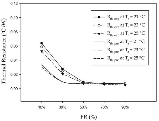 For further elaboration of the performance of thermosiphon heat exchanger, performance was investigated in terms of thermal resistance of the STPTL. The heat dissipation from the heater is regarded as Q and 45 thermocouples were used to measure the average air inlet temperature (Tai) and outlet temperature (Tao), and some other thermocouples were used to measure the average temperature (Tc,avg) of the condenser. As mentioned earlier, the experiment was conducted at constant heating load (4 kW). However, the actual heat absorbed by the thermosiphon varies with operating conditions, such as rack inlet temperature (ambient temperature) and filling ratio. As depicted in Figure 8, there is no direct contact between heaters and thermosiphon, yet; the amount of heat transferred to the evaporator depends on the temperature in-between the heaters and thermosiphon (Th). Hence, heaters’ temperature can be calculated as: