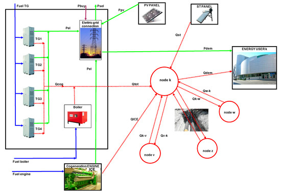 The distributed cogeneration and district heating system is schematized in Figure 1, where the generic user k is shown, which receives the thermal energy from the corresponding node k of the network. The latter receives the thermal energy from the cogeneration units, from the solar thermal collectors and from the Boiler possibly present at the same user k, but is also able to exchange thermal energy with the other nodes of the network (in Figure 1 there are shown three other generic nodes: v, w, z). Likewise, electrical energy arrives to the user through an electric connection where the electrical energy, eventually produced by cogenerators and PV panels installed at the node, can be integrated or exchanged with the external electrical network. Therefore, the problem cannot be solved separately for each cogeneration unit installed at a specific building because each of them is connected with the district heating network through a node where income and outcome thermal energy flows can be potentially exchanged with any other node of the network and the heat demand faced by each unit is not defined “in advance”. Then, the optimal operation has to be defined jointly with the optimal synthesis of the district heating micro-grids and with the number and position of CHP engines.