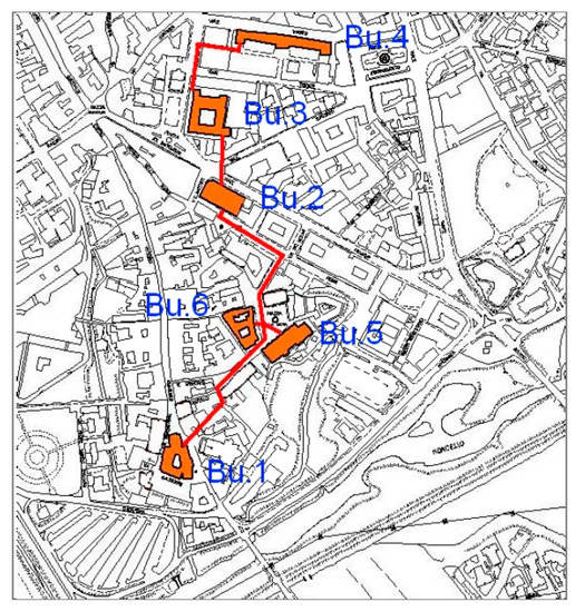 Plan of buildings and path of district heating network in the Pordenone city center: (1) Town Hall, (2) Theatre, (3) Library, (4) Primary school, (5) Retirement home, (6) Ex-monastery.