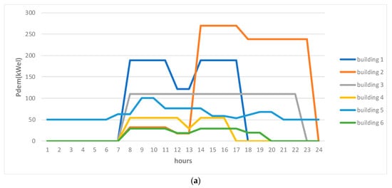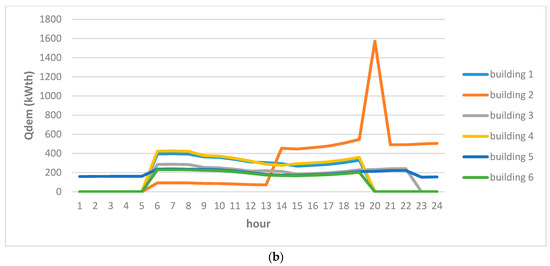 (a) Electrical energy demand (Pdem) for a typical January working day (24 h), for the 6 buildings considered. (b) Thermal energy demand (Qdem) for a typical January working day (24 h), for the 6 buildings considered.