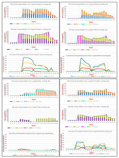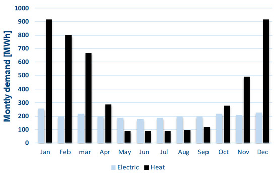 In [36] the approach of identifying a set of proper typical days is used in the optimal design of a multi-energy system with seasonal thermal storage, while in [37] an improved adaptive genetic algorithm is proposed to model the typical day load sequence for multi-objective optimization of a distributed generation system. In Figure 3a,b, the energy demands of the six buildings are shown for a winter working day, as an example. It can be noticed that the thermal demand peak of building 2 in an evening hour, is caused by the specific activity of a city theatre, that starts in the evening requiring the heating of a big empty volume. In Figure 4 the total monthly energy demands are shown for all the year. Notice that the thermal demand shows strong seasonal variations, as it is common for civil buildings in the central European region. During summer time, the usage of the buildings is less frequent, so that the electrical demand is lower than in the winter time, while the opposite often occurs today for dwelling buildings, because of the air conditioning consumptions.