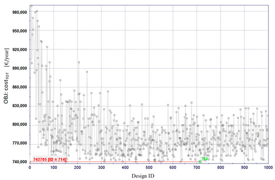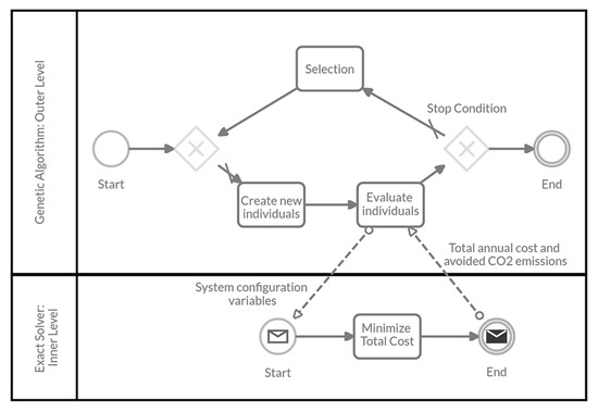 As shown in Figure 5, a simple iteration loop has been defined. During its optimization loop the genetic algorithm assigns the values to the system configuration variables defining the current generation of individuals (i.e., variables X (j, k) and r (k, v) introduced in Section 2). The problem has been set with 40 individuals per generation and 25 generations. The individual evaluation phase is made on the basis of the results of exact solver at the inner level. The latter receives the configuration variables of each individual and, for each of them, it performs the operation optimization using the total annual cost (CostTOT, Equation (1)) as objective function.