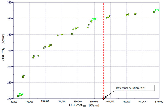 The modeFRONTIER® software enabled us not only to keep the original MILP model used in the direct approach, but also to integrate it in a hierarchical optimization workflow. After an exploration of different optimization algorithms, we decided to use the non-dominating sorting genetic algorithm NSGA-II, widely discussed in literature [51]. We considered it the most suitable approach for tackling the outer level of this problem in terms of result accuracy and convergence rate. Furthermore, this approach enabled us to use the multi-core processor of the computer and thus perform in parallel multiple inner level runs, which significantly sped up the optimization process. Repeated optimization test runs resulted in the optimal problem solution in less than 15 min with an accurate exploration of the design space.