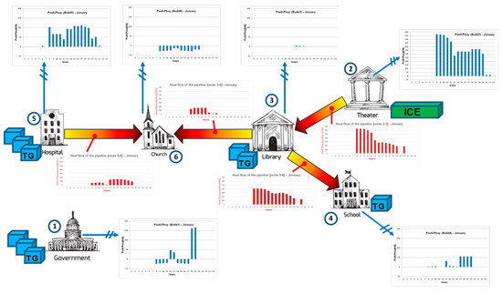 In Figure 2 it is shown the city center map with the location of the six buildings and a possible pipeline network of the district heating system. To reduce the overall number of variables, the whole year can be modeled by taking into account a small number of “typical days” for energy demand and rates. In the case study, 24 typical days have been considered (one working day and one public holiday, for each month). In this way the energy demand of the whole year is adequately approximated by repeating a proper number of times each typical day. This approach is widely accepted in literature (see, for instance, [15,16,34]). Recently, Pfenninger presented a systematic analysis of the different techniques to reduce the computational effort for energy models resolution [35], including time slices and typical days or weeks identification.