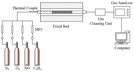 The experiment setup for testing catalytic activity is shown in Figure 1. It included a fixed-bed, quartz tube reactor (i.d. = 20 mm) heated by a temperature-controlled furnace; during testing, the weight of the sample was 10 g. Gas flow rates were controlled at 1500 ml/min by a set of mass flow controllers (MFCs, MF SHY 400) which produced a simulated gas mixture of 500 ppm NO, 500 ppm C2H4, 3 vol.% O2, and N2 as a balance. The gas mixture was flowed into the reactor after the temperature attained a stable state and gas concentrations of outlet NO and NOX were analyzed using a flue gas analyzer (MRU). NO conversion and NO2 selectivity were evaluated according to the following equation: