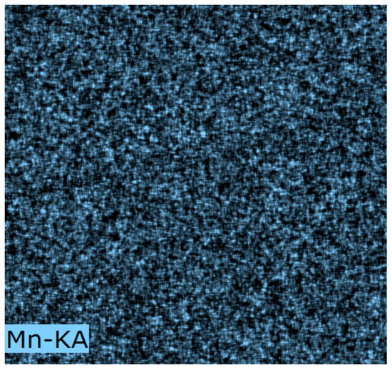 EDS data from Mn(0.03)/NAC are shown in Figure 3; the elements detected were C, O, Mn, Si, and Al with C and O the main constituents. The relatively small amounts of Si and Al were expected to originate from ash of the original precursor to the AC before it was processed into activated carbon. For this sample, the Mn concentration was 2.82 wt.%, a value close to the theoretical value of 3.0 %. The EDS mapping of Mn species in Figure 4 further demonstrated that Mn was highly distributed on the surface and contained insignificant Mn agglomerates.