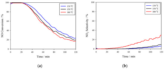 As can be seen in Figure 5, all three catalysts produced excellent NO conversion of close to 100% in the first 30 minutes of reaction time at all of the temperatures tested, indicating that they may be effective for low-temperature HC-DeNOx applications. However, they experienced rapid decreases in conversion with decrease rates having an order of 130 °C < 150 °C < 180 °C; after 2 h of reaction testing, the NO conversions for all three test conditions were less than 30%, indicating the overall integrated activity was poor. N2O using gasbag sampling was measured by GC to less than 2 ppm—considered too minor for discussion, therefore, not discussed in this study. The initial NO2 selectivity was very low and near 0% during the first 20 min of testing, as shown in Figure 5b. For reaction temperatures of 130 °C and 150 °C, the NO2 selectivity remained at less than 10% during the entire tests.