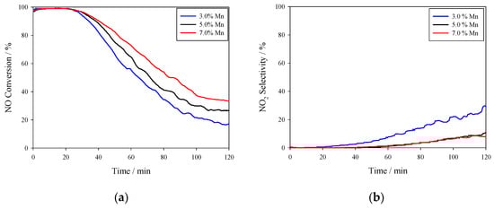 Similar to the data in Figure 5, the NO conversion and NO2 selectivity in Figure 6 for the catalysts with three different Mn loadings had high initial conversion activity and very low NO2 selectivity which then the NO conversion began to decrease and the NO2 selectivity began to increase ~30 min after the testing was begun; NO conversion for these loadings followed the order 3% < 5% < 7% and NO2 selectivity had an order of 7% ~ 5% < 3%. During deactivation, the NO conversion dropped to between 20 and 35% whereas the NO2 selectivity increased to 10–25%.