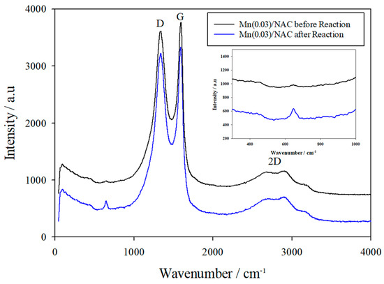 Figure 9 displays the Raman spectra of the Mn (0.03)/NAC catalyst before and after reaction testing. Both spectra have a peak at 1357 cm−1 (D) and 1643 cm−1 (G), and bands in the 2700–3100 cm−1 region (2D); the characteristics and locations of these point to Raman scattering from the AC itself [61]. Although a very weak band is apparent at 643 cm−1 in the fresh catalyst, its intensity is enhanced greatly in the used catalyst. Reference spectra of Mn3O4 show an intense peak at 650 cm−1 (A1g) corresponding to the symmetric stretching of the Mn–O bonds, and weaker bands at 480 (T2g), 370 (Eg), 325 (T2g), and 295 (T2g) cm−1 [62]. In comparison, the Raman spectra of the Mn (0.03)/NAC catalyst after reaction testing have peaks at 647, 479, and 365 cm−1, positions of which are consistent with the presence of Mn3O4 and in agreement with the speciation reported in other studies [63]. Therefore, Mn3O4 is present in the deactivated catalyst whereas before testing, the manganese oxide was more disordered then after testing; the Raman results are consistent with the XRD data.