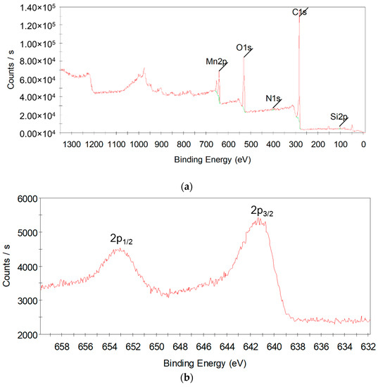 XPS spectra of Mn (0.03)/NAC after reaction: (a) survey; (b) high resolution of Mn 2p.