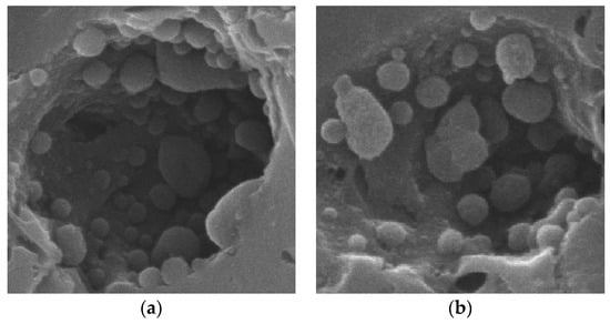 Besides Mn-containing agglomerates on the surface of the carbon, some pores of the activated carbon in tested catalysts contained spheres, as shown in Figure 12. The elemental composition of these spheres is listed in Table 2; according to SEM/EDS data, they contained 90.0 wt.% carbon and 1.4% Mn. Because the monitoring diameter and depth of EDS was approximately 10 μm, it is possible that Mn within the pores of the catalyst separate from the spheres themselves was also detected. These spheres were most prevalent in part of the tested catalyst, meaning that their formation was associated with catalytic activity. It is known that MnOx decomposes hydrocarbons at low temperatures near 200 °C and forms carbon black [15]. Hence, the spheres are expected to be a type of carbon black that is deposited within the pores during the decomposition of C2H4. These carbon spheres may cover the manganese oxides [43] and cause some blockage of the pores, and thereby also diminish the HC-SCR activity.