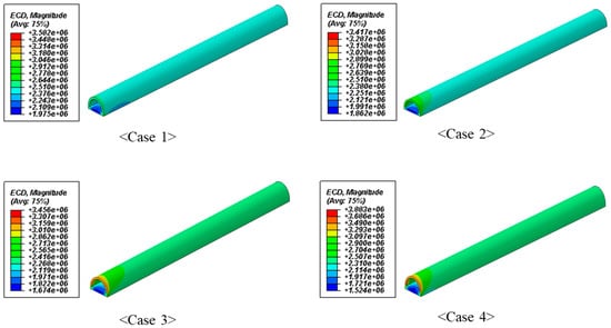 Figure 4 shows the results of the current density analysis in tunnel-type bus-bar as a function of thickness. The tunnel-type bus-bars also show uniform current densities on the whole regardless of the thickness. It was confirmed that there was no position that acted as a localized resistance when the current was applied to the tunnel-type bus-bar.