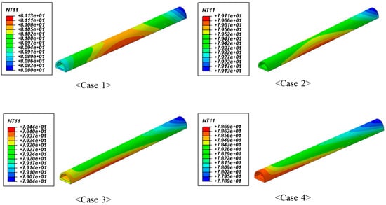 Figure 5 shows the results of the thermal analysis in tunnel-type bus-bar as a function of thickness. The elevated temperatures due to the exothermic reaction at the center of bus-bar are shown in Table 3. The tunnel-type bus-bar which has the same sectional area with the plate-type bus-bar shows lower heat generation temperature. The tunnel-type bus-bar which showed the lowest temperature was 8.4 °C lower than the plate-type bus-bar. It was analyzed that the inner area exposed to air through the tunnel structure is advantageous for heat dissipation and the inner area exposed to air was increased with the decrease of the thickness of semi-pipe part. Therefore, the thinner thickness of the semi-pipe part in the tunnel-type bus-bar causes more heat dissipation and lower temperature of bus-bar. Consequently, it is important to determine the semi-pipe part and plate-part thickness considering the efficiency of manufacturing.